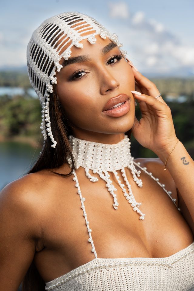 Gorro tejido en crochet con delicados apliques de perlas, una fusión entre elegancia artesanal y estilo contemporáneo.
