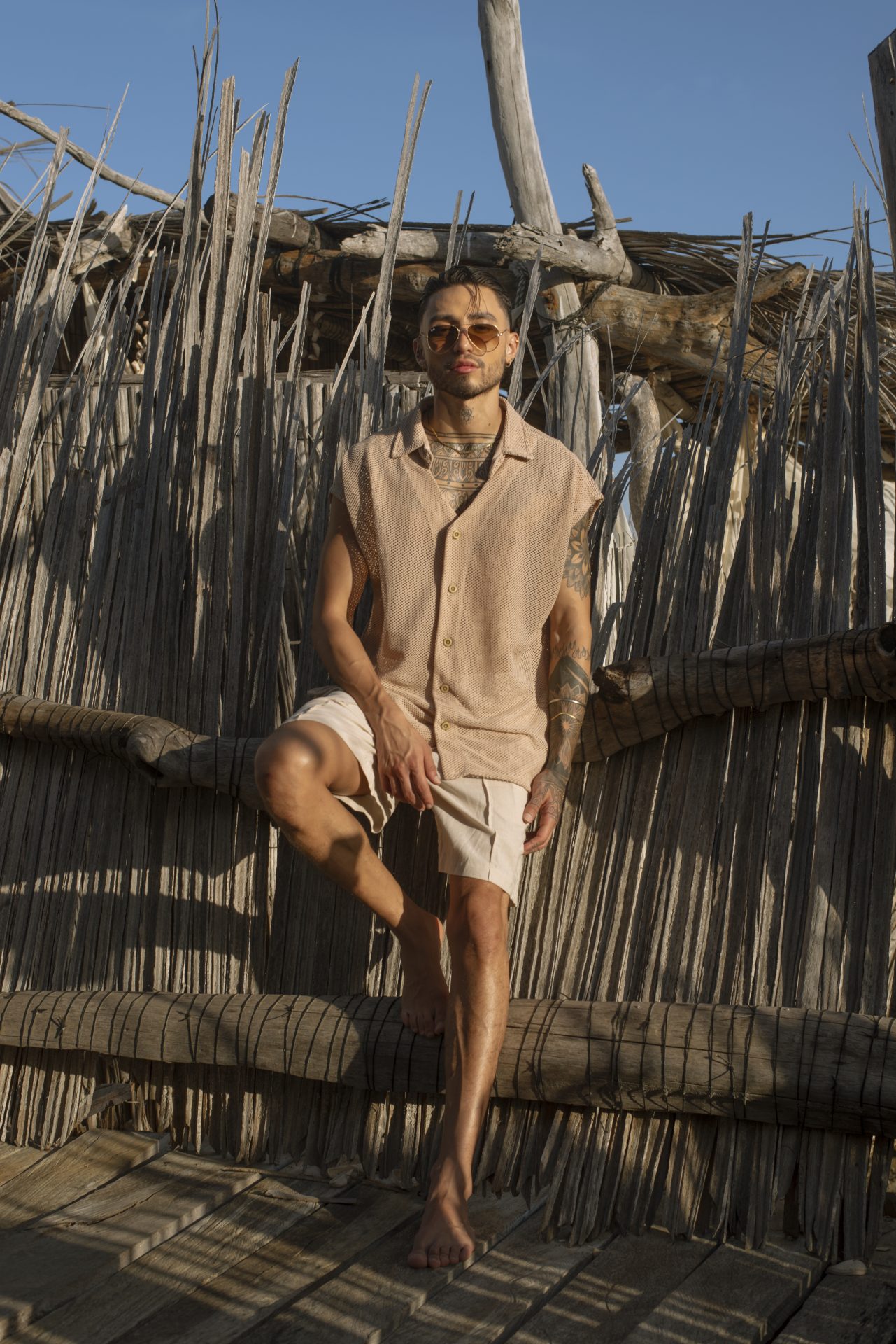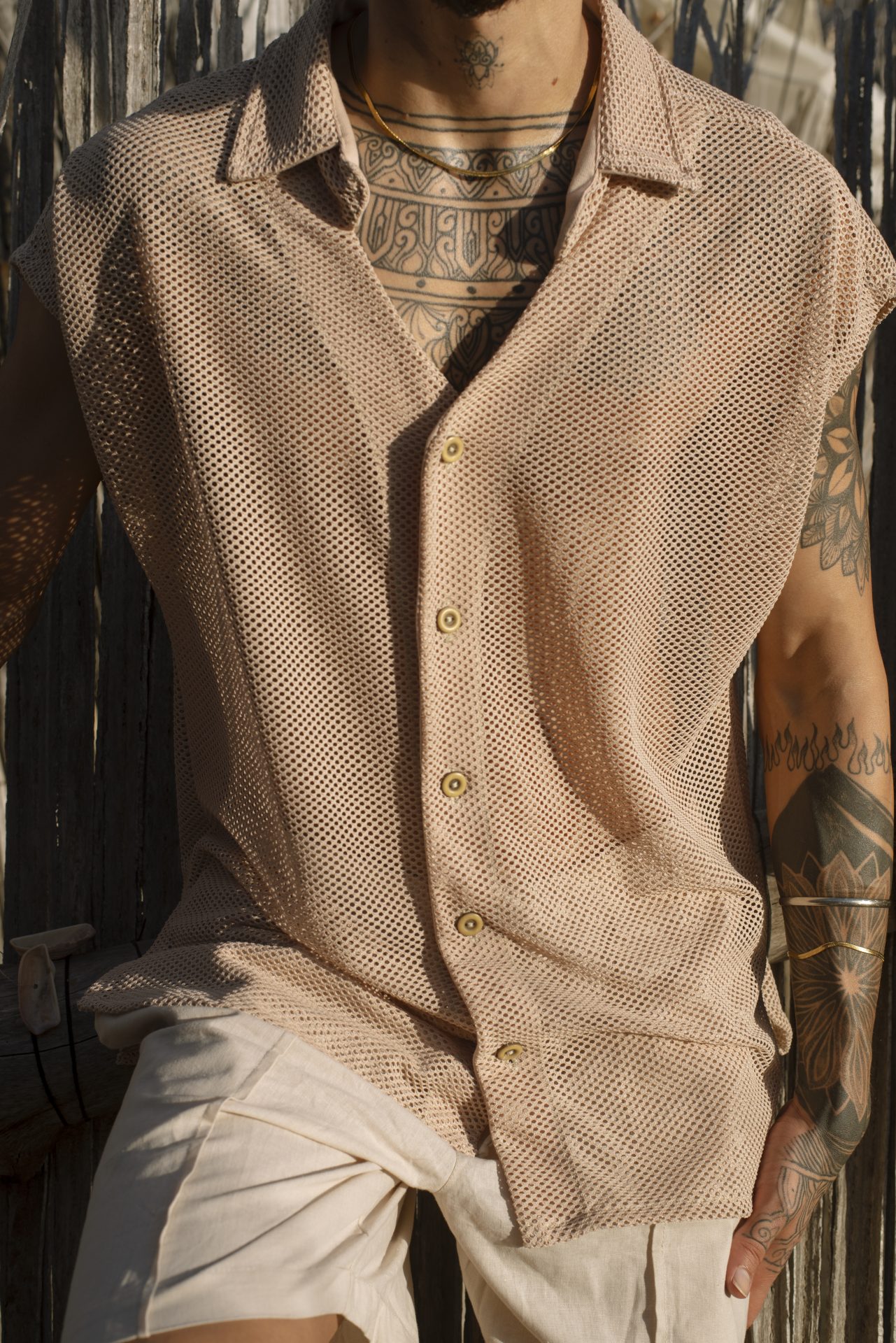 Camisa en malla con botones y pantaloneta en lino natural. Frescura y estilo.
